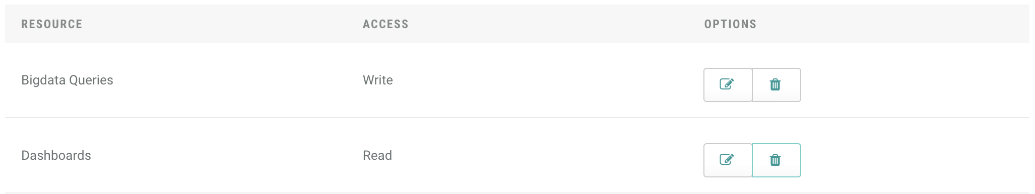 To select a resource and change the permissions to Read, Write, or Admin: