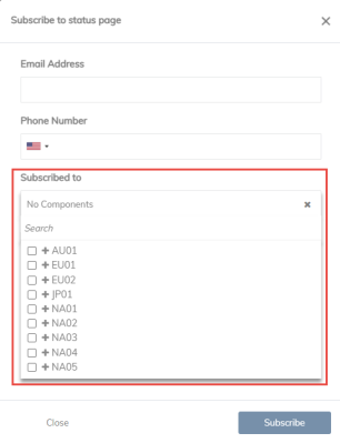 In the next input box you can choose the Components you want to subscribe to. This is the different technical environments in each region. If you are unsure of the name of your technical environment, please contact your Marigold CSM, who will be able to provide this information. You can choose 1 or more environments as required.
