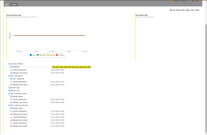 The second tab 'History' returns journey interaction information. For each journey the contact participated in, an entry is displayed: