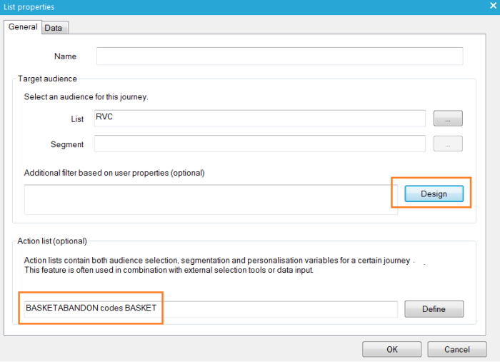 - In the action journey, open the properties of the audience component. Make sure that the action list and action code are selected and click the "Design" button to design an additional filter on the audience