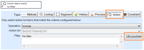 - In the filter designer, an extra type "Action" is available because the action list is selected on the audience. Select the type "Action" and click on "Edit constraint".