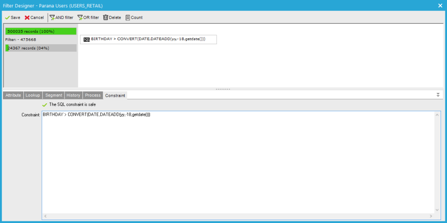 The date of birth is stored in the audience list as a datetime field. For this reason we need to apply a function to the birthday field that extracts the date and then compares it with today - 18years. Place the created filter in the Constraint tab: