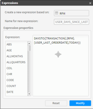 Formula used: DAYSTO([TRANSACTION].[RFM].[USER_LAST_ORDERDATE],TODAY()). It calculates the number of days between a given date (last order date) and today.