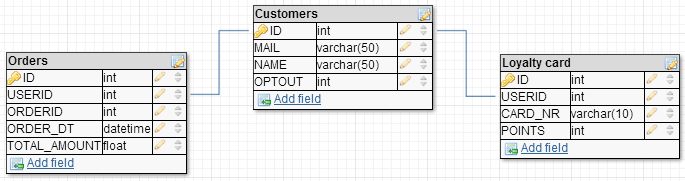 Only the ID of the record is predefined. All the other fields are custom. Below a small example of a profile extension (1:1) "Loyalty card" and a 1:N linked list "Orders"