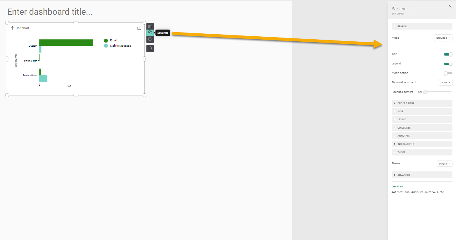 The settings of a component allow you to define the properties for the current component, such as the title, the theme, etc. Which settings can be defined depends on the type of component.