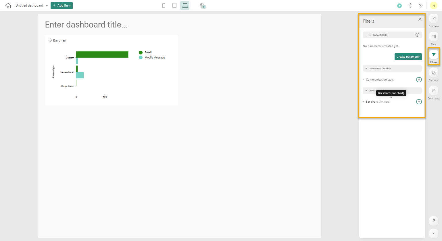 Add filter - allows to add a filter that will only apply to this specific component. The Add filter button is only displayed after clicking the Data icon.