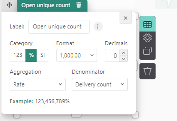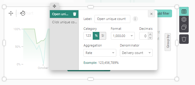 3. Drag and drop the CLICK_UNIQUE_COUNT onto the measure of the second Number component. Change the settings to display a Rate with as denominator DELIVERY_COUNT.