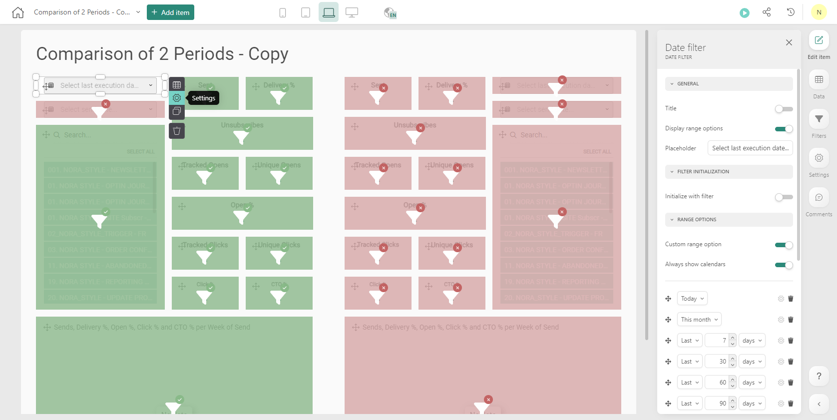 2. Components depending on the Date slider are displayed in green. To unlink a component and make it no longer dependable on the filter, click the Filter icon in the component.