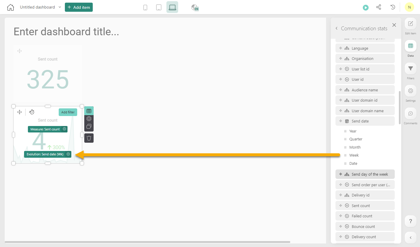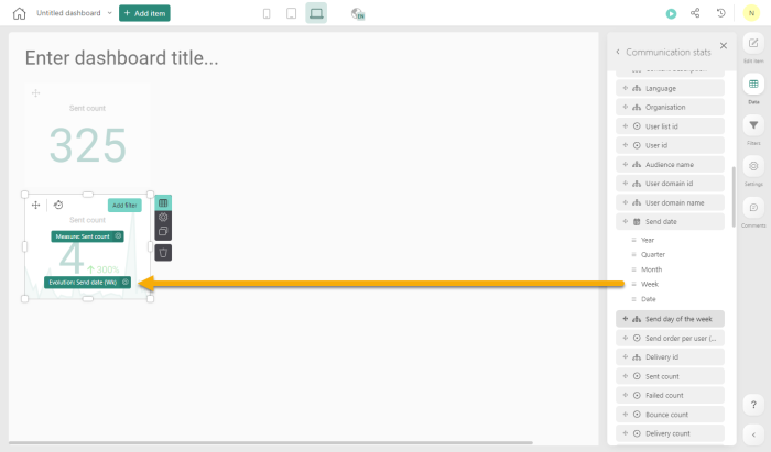 5. In this cloned Number component, we want to show the evolution per week of the number of emails sent. To do so drag and drop the "Week" of the SEND_DATE onto the evolution:
