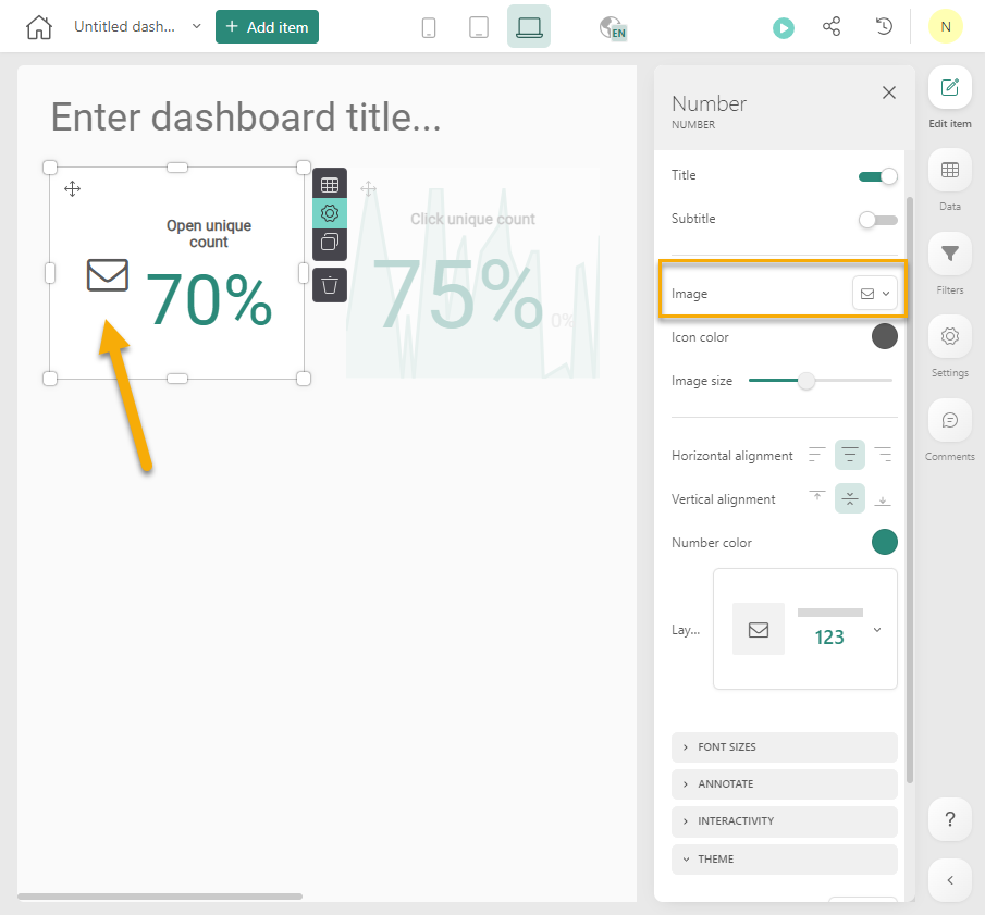 5. Last, add an icon to the Number component. Click on the Settings icon of the Number component and in the properties on the right, select the icon to apply: