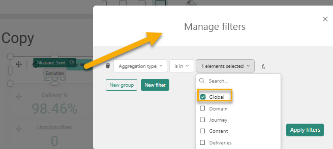 Example: Domain name is only available for the global and domain aggregation filter. Journey type is only available at journey, content and deliveries level.