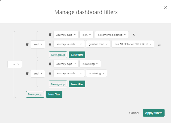 When either one of the conditions is met, the journeys are included in the dashboard. This means that the OR operator is applied as following between the 2 groups of filters: