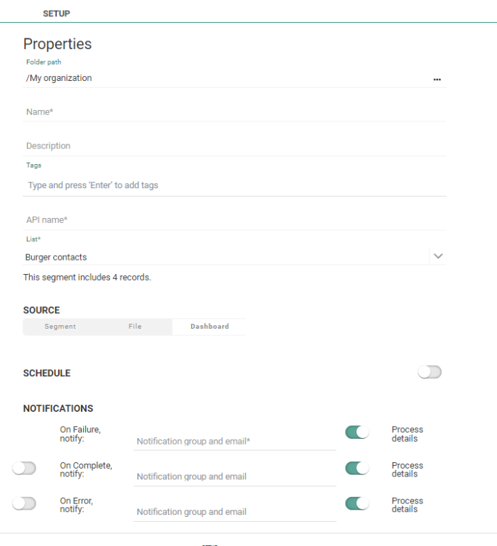 - If required, configure the schedule of the static segment updates. This performs an automatic update of the static segment at regular time intervals. When saving the configuration, the static segment is created immediately and data is loaded. The schedule details and update history is visible from the Segments overview in the Lists chapter.