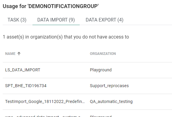 If a notification group is not used at all, a corresponding message is shown.Example of a notification group that is used in 3 tasks, 4 data exports and 9 data imports, from which the user can't access 1 asset because they do not have access to its Organization :