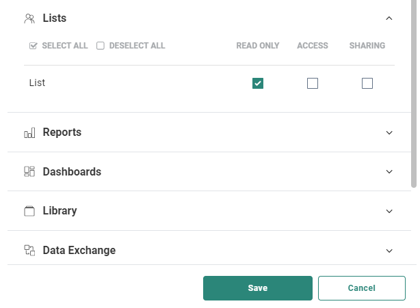 - Read-Only rights give the user only the permission to use existing lists in Content and Journeys, and to open and view them in the Lists chapter without the right to make any changes nor creating new ones.Note: When Read-Only is selected, the Access and Sharing checkboxes are automatically cleared, as they can't be combined.