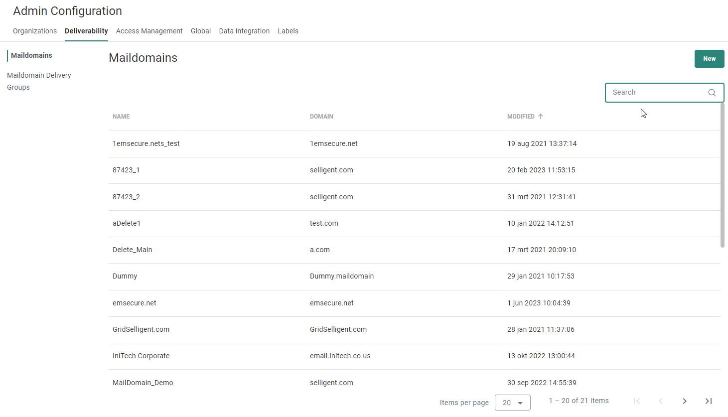 To create a new maildomain, click on the New button