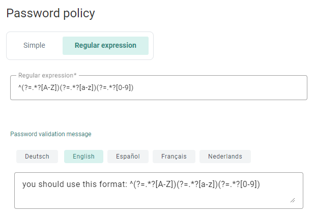 the password pattern that is required for a valid password. A validation message can be added, per language, to explain to the user what is expected.