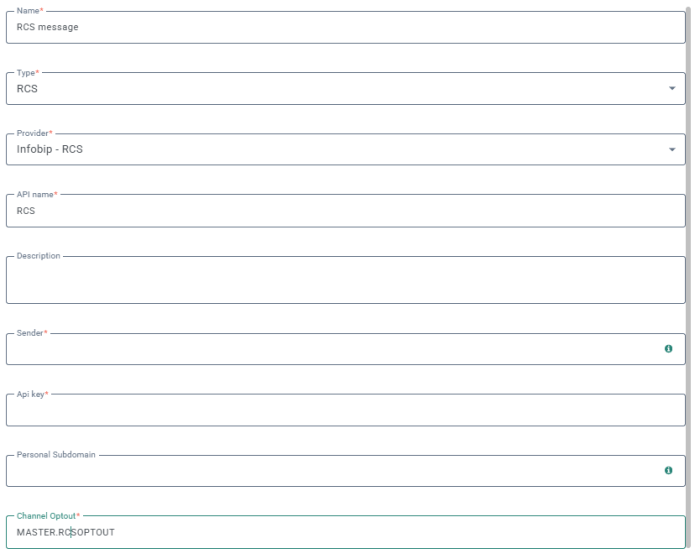- Provider* — You must choose the linked RCS plugin to use for this endpoint. Depending on the selected RCS plugin, different connection parameters are required. At this point, Infobip is supported.