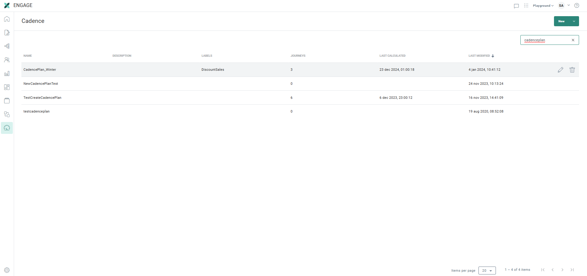 The Cadence Start page lists the current Cadence Plans with their description and tags. Additionally, information is available on the number of journeys that are included in the plan and when the plan was created and last calculated.