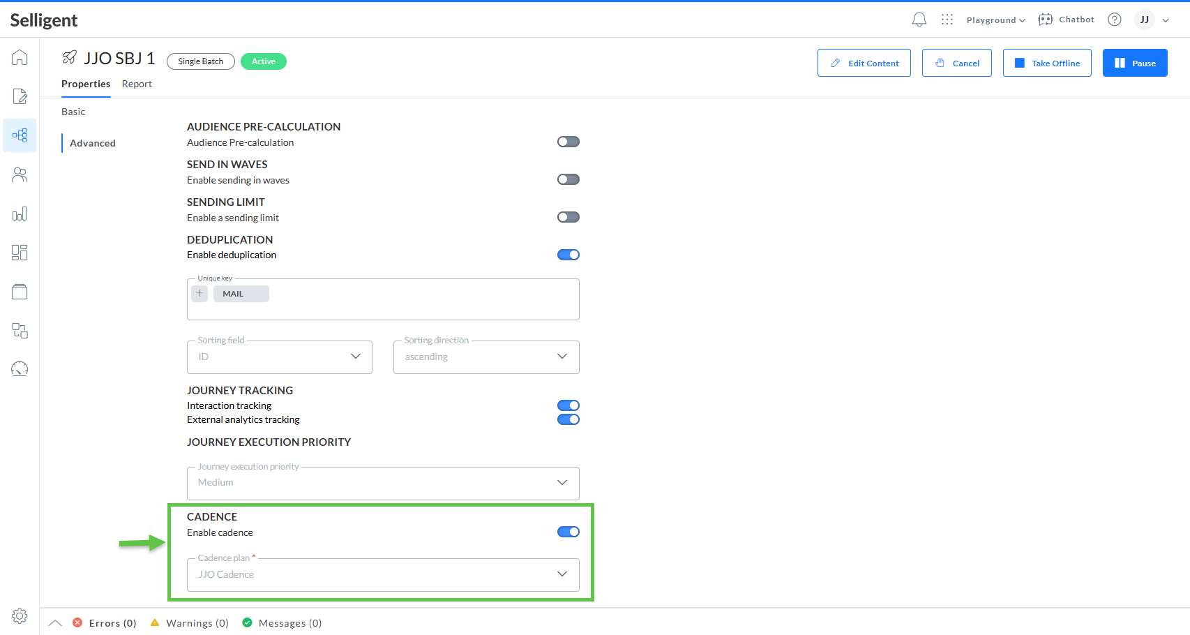 Note: Currently Campaign journeys using interfaces (mobile push, sms) are not supported by Cadence Management in Selligent.