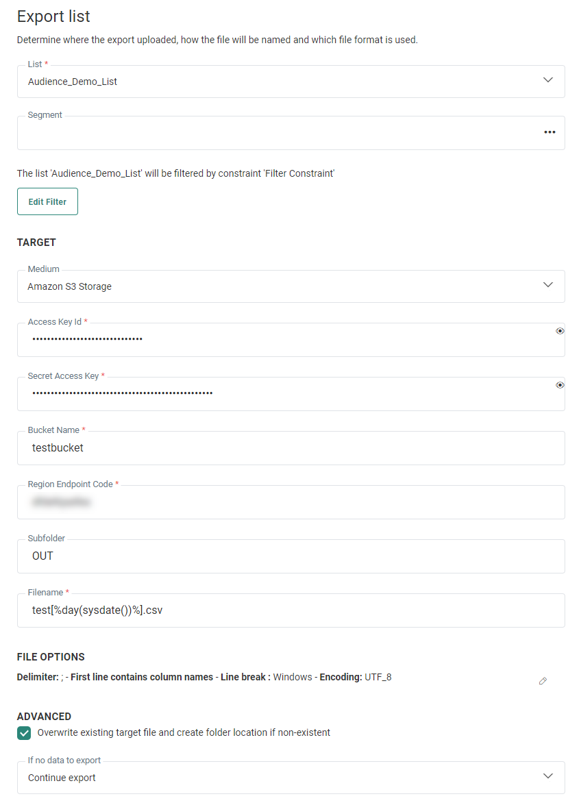 List — The name of the Selligent list to export. A drop-down list is available for you to choose one from.