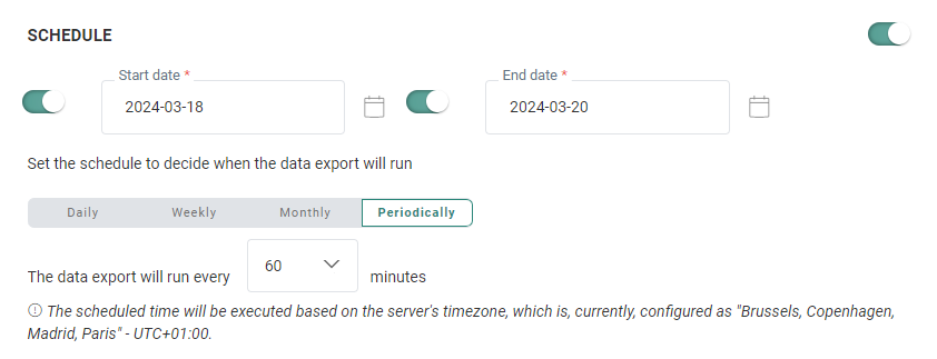 If the export needs to be scheduled, toggle the option on and define the schedule.