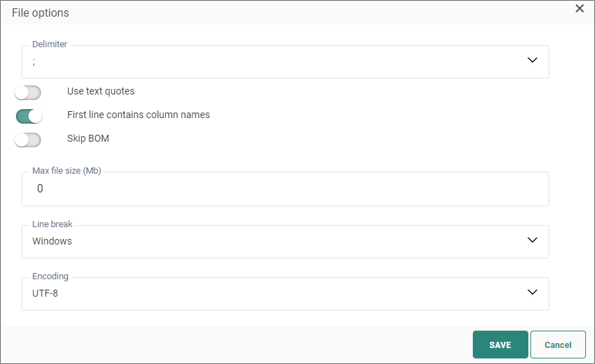 • The file delimiter can be set to colon, semi colon, tab or pipe delimited. By default the delimiter is set to ;.