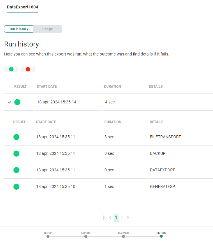 Once the export is configured a History tab provides details on the execution of the export, the duration, start date and details if an error occurred.
