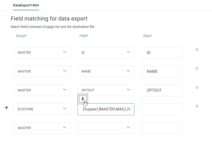 Note : The order of the fields determines the order of the columns in the export file. You can easily change this through drag and drop of a field. Just hover the line you want to move and click this icon to drag the line to a new position.