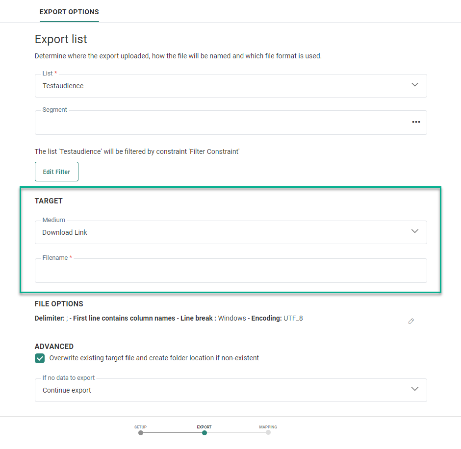 • Download Link — With this option selected, a download link becomes available on the Data Exchange > Imports/Exports start page, to locally download the (full or filtered) data export as CSV file.