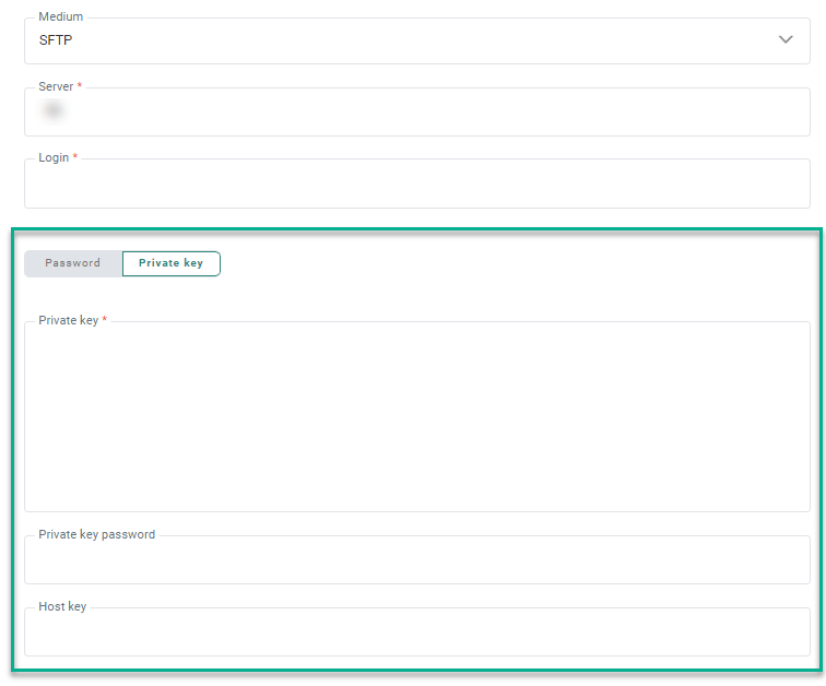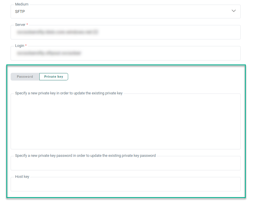 Note: The data from both fields (private key and private key password) is stored encrypted in the database, and only used when transferring the files.