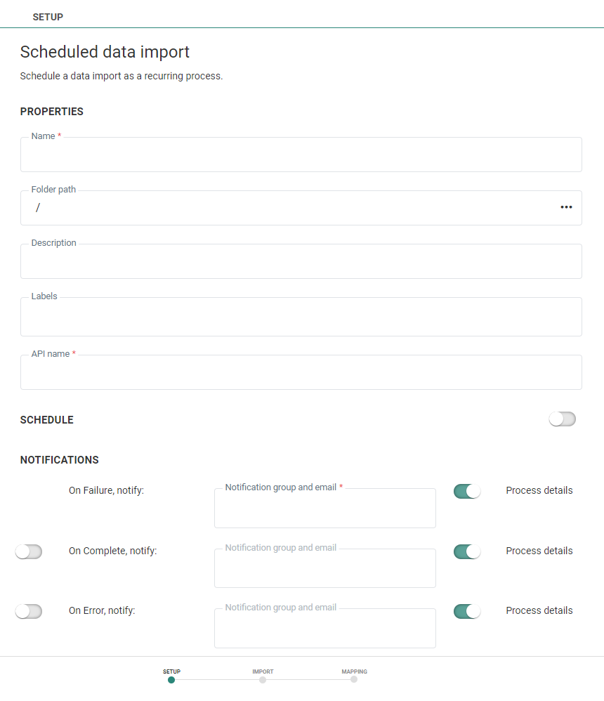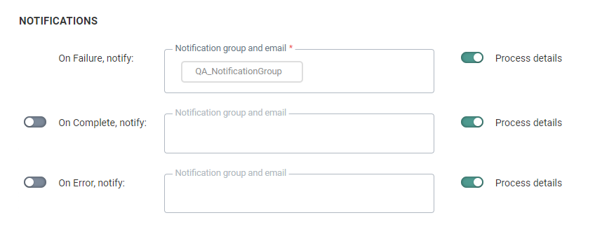 Note: Setting one or more notification group(s)/email address(es) for when the import fails is mandatory. The other notifications (on complete, on error) are optional.