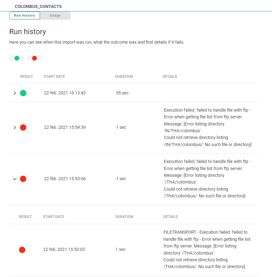Once the import is configured, a History tab provides details on the execution of the import, the duration, start date and details if an error occurred. This information is available from the Run history.