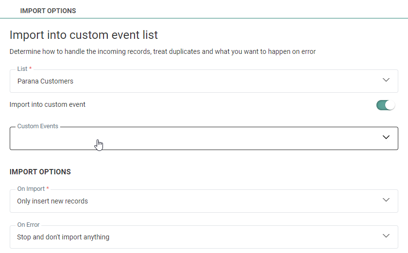 To import into a Custom Events List, you first need to select the Audience List. A toggle allows activating the import into Custom Events. All Custom Events linked to the selected Audience List are listed in the drop-down below the toggle: