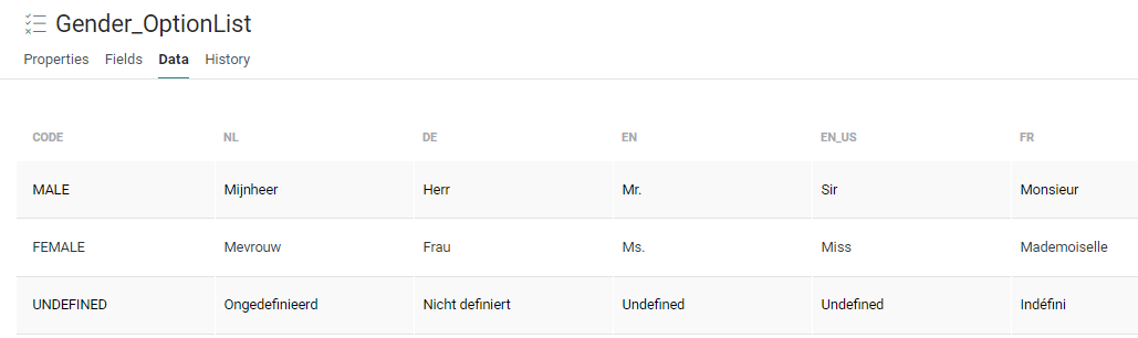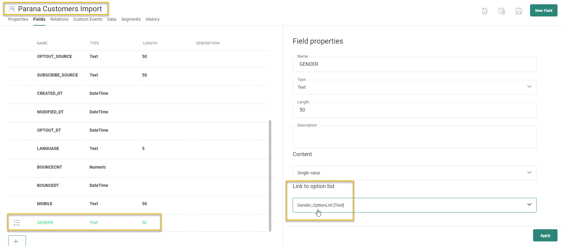 We are using the Audience List 'Parana Customers Import', where the Gender field is linked to the Option List 'Gender_OptionList'.