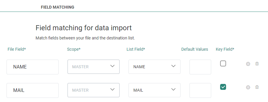 Scope — This column is only available when performing an import into an Audience List. It allows for import into 1:1 linked lists for the selected audience. Select the 1:1 linked list into which the data from the source file needs to be imported.