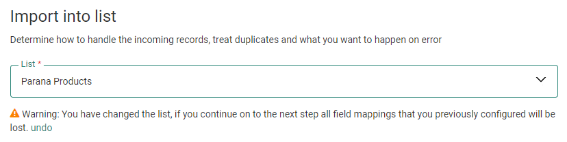 Note: When changing the list after the field mapping has been defined, a notification is displayed indicating that all column mappings will be lost if you continue. You can undo the change by clicking the corresponding undo link and reset the audience to the previously selected one.
