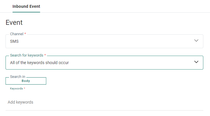 Inbound Events are incoming events that can be used in a journey to react upon. For now, these Inbound Events are linked to the SMS and WordPress channels.