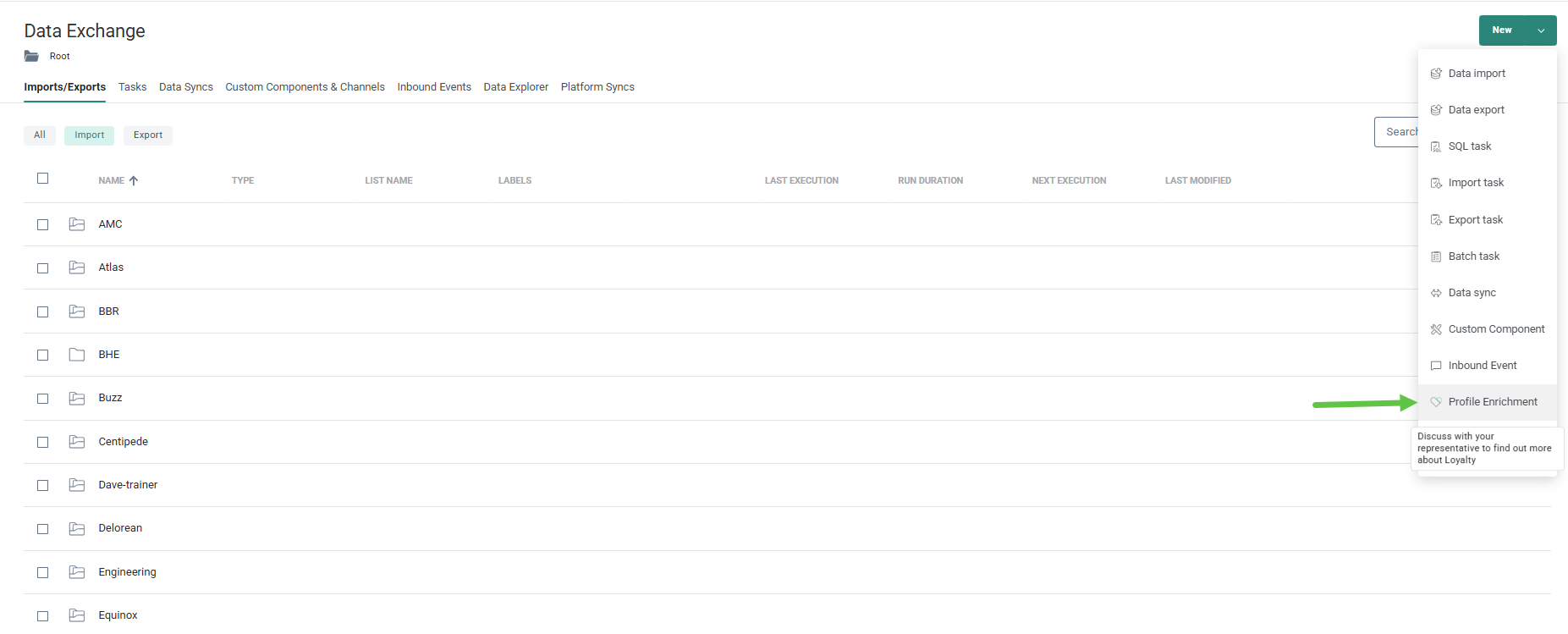 1. Setting up the continuous data stream is done through the Data Exchange chapter. Click New and select Profile enrichment from the drop-down.