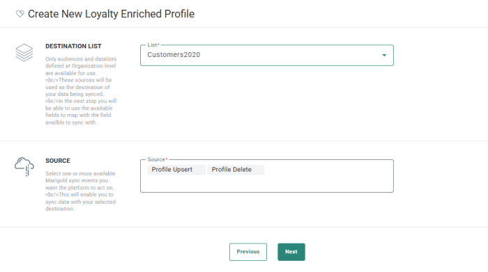 Destination List — Select the Audience List or extended profile where you would like to store the profile information coming from Loyalty.