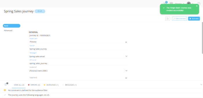 Note: To get detailed information about all basic and advanced settings in Single Batch Journeys, consult this topic.