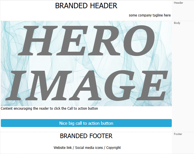 When creating marketing emails, they often follow a familiar structure with common components. These elements may be fully fixed, partially editable, or fully customizable. Examples include: