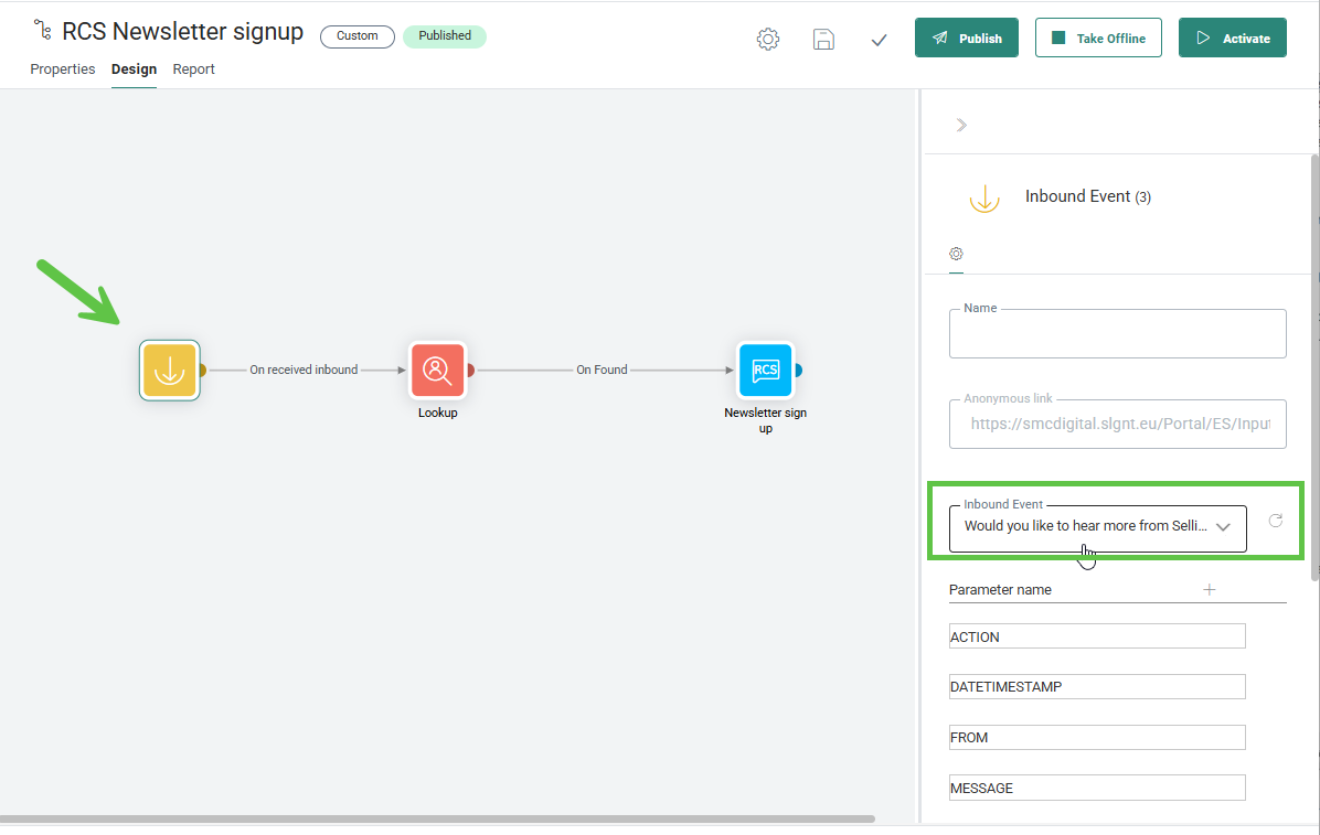 2. Configure the Inbound Event Component to use the inbound event created earlier. (Example: Would you like to hear more from Selligent_YES)