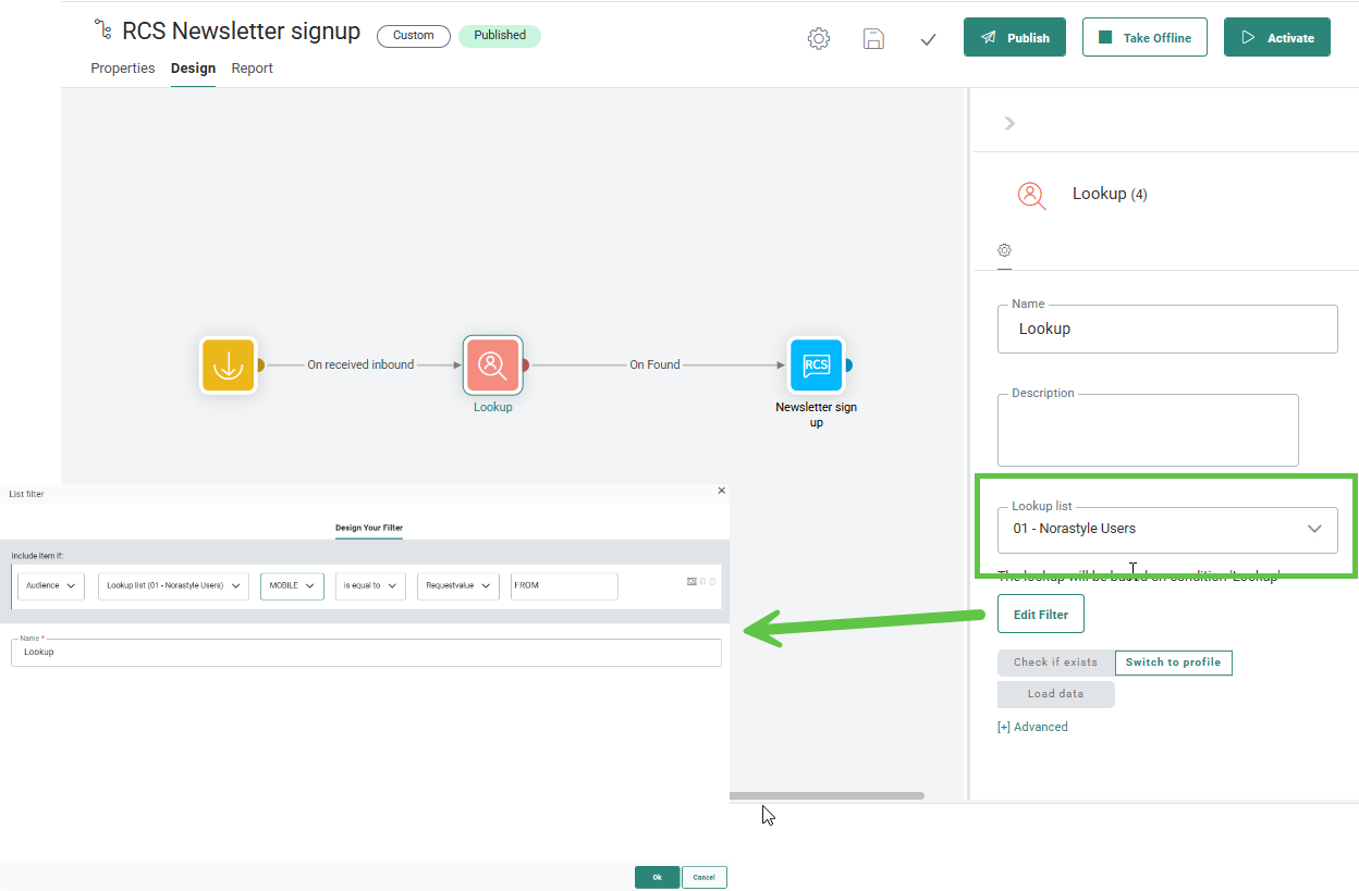 3. Next, add the Lookup Component to filter the incoming messages to only include the ones coming from the right audience. This is the audience that was targeted by the initial RCS message.