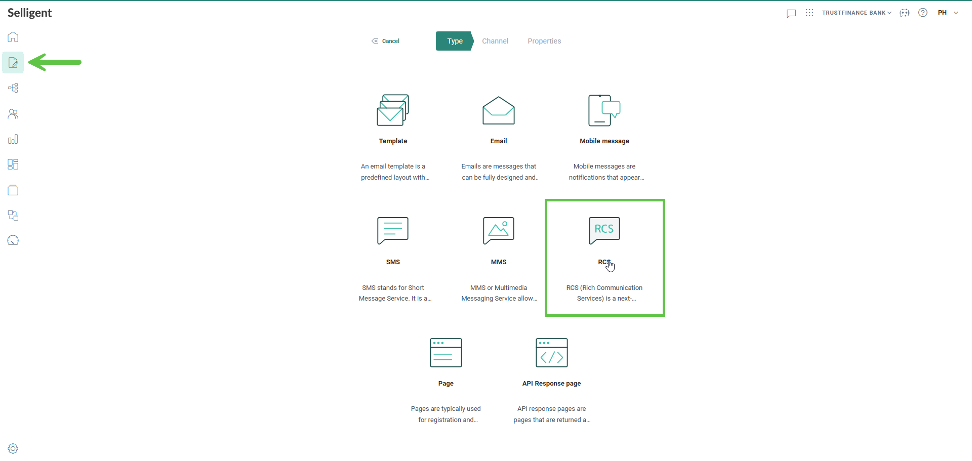 3. On the next tab, set the Channel to SMS.