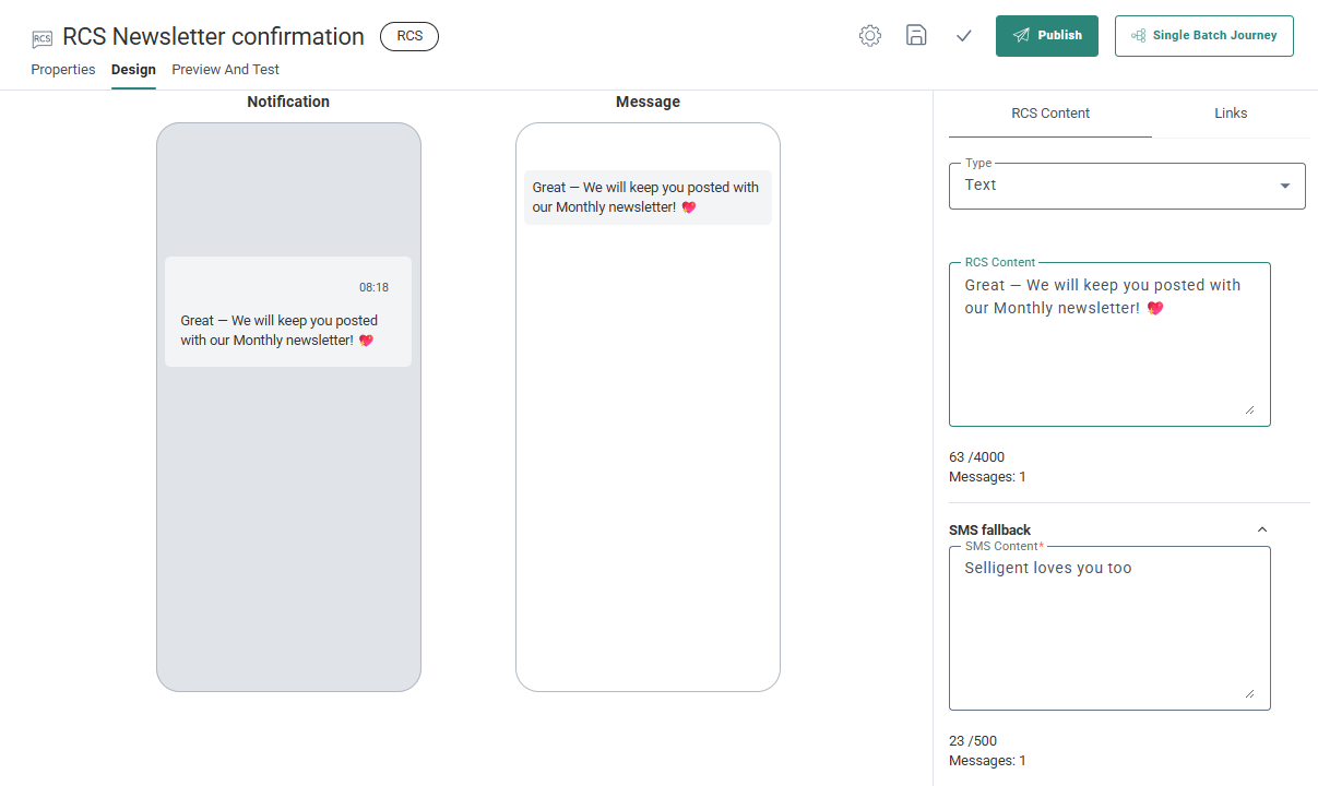 This journey initiates the conversation by sending an RCS message to which the recipient can reply. This can be a simple Single Batch journey.
