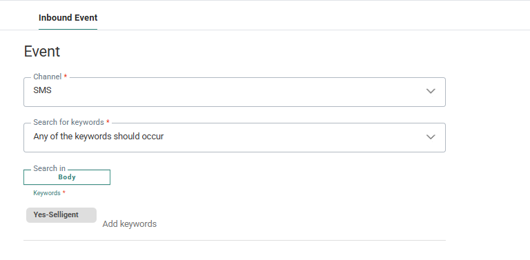 This means that every incoming SMS message containing the keywords (example: Yes-Selligent) defined in the Inbound Event will trigger this journey: