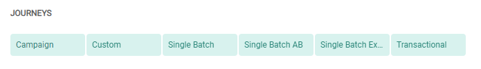 - for Engage journeys: Custom, Recurring Batch, Single Batch, Single Batch AB, Transactional