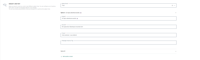 By default, each language field in Option A is pre-filled with the default subject line as set in the message.