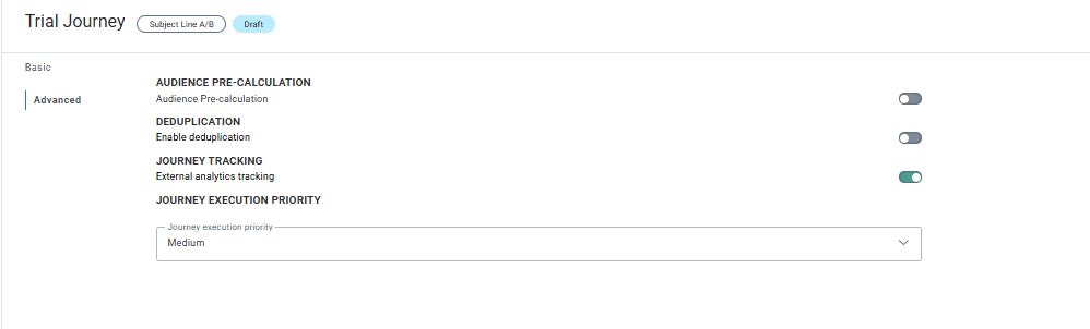 The Basic entry is used to set the general properties for the Subject Line A/B Journey.